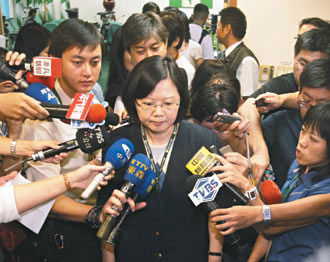 民進(jìn)黨昨天舉行臨時中常會,面對媒體追問陳水扁爆發(fā)洗錢丑聞事,民進(jìn)黨主席蔡英文(中)面色凝重。臺灣《聯(lián)合報》圖