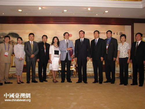 河南省委副書記陳全國(右五)會見臺灣經(jīng)貿(mào)交流訪豫團合影。▉碓矗汉幽鲜∨_辦)