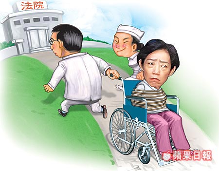 公務(wù)機(jī)要費(fèi)案本周五將再度開(kāi)庭,法院請(qǐng)求醫(yī)院支持吳淑珍到庭所需的醫(yī)療設(shè)備及醫(yī)護(hù)人員,以備不時(shí)之需。圖為臺(tái)灣《蘋(píng)果日?qǐng)?bào)》漫畫(huà)