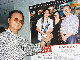 據(jù)報(bào)道,南投縣文化局地下展覽室最近舉辦了一場(chǎng)名為“合家和樂(lè)”的畫展,進(jìn)入展覽室就可看到一幅全家合影照片,從小學(xué)教師崗位退休的許合和指著照片說(shuō):“這是我,這是我老婆汪淑華,年輕的是兒子許孟康,全家都是畫家,也一起開畫展。”