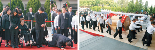 王永慶遺體昨天入殮,家屬分列兩旁迎棺;長子王文洋行跪拜禮。