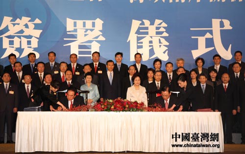 陳云林江丙坤交換協(xié)議文本。中國(guó)臺(tái)灣網(wǎng) 田云鵬攝 中國(guó)臺(tái)灣網(wǎng)11月4日臺(tái)北消息 海協(xié)會(huì)會(huì)長(zhǎng)陳云林與;鶗(huì)董事長(zhǎng)江丙坤今日下午簽署海運(yùn)、空運(yùn)、通郵和食品安全等四項(xiàng)協(xié)議。(田云鵬)