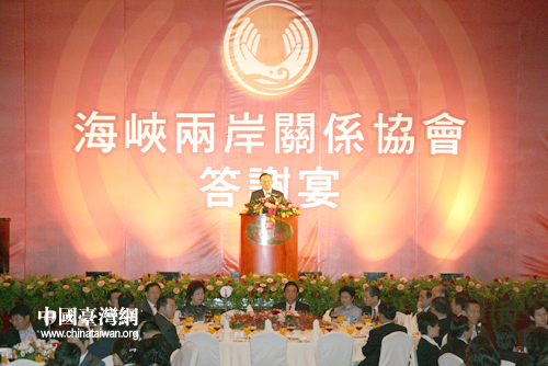 中國(guó)臺(tái)灣網(wǎng)11月6日臺(tái)北消息 海峽兩岸關(guān)系協(xié)會(huì)6日晚在臺(tái)北市圓山飯店舉行答謝晚宴,宴請(qǐng)海基會(huì)董事長(zhǎng)江丙坤及;鶗(huì)有關(guān)人士,并慶祝兩會(huì)成功簽署四項(xiàng)協(xié)議。