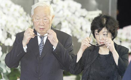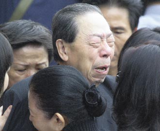 王永慶夫人李寶珠在靈堂前行跪拜大禮,思念丈夫的情緒與淚水一起宣泄。圖:臺(tái)灣《聯(lián)合報(bào)》