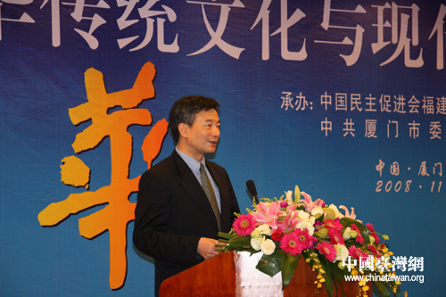 國民黨中常委、中華兩岸文化經(jīng)濟(jì)協(xié)會理事長廖萬隆在閉幕式上致辭。他以國民黨中央委員會的名義和廈門市榮譽(yù)市民的身份,向與會的兩岸專家學(xué)者表示敬意和歡迎。他從300年前祖先從漳州到臺灣討生活、300年后自己從臺灣來廈門開創(chuàng)事業(yè)的歷史談起,激動(dòng)地表示,中華民族幾千年流傳下來的文化倫理是中華民族實(shí)現(xiàn)現(xiàn)代化的精神動(dòng)力。傳統(tǒng)文化要和現(xiàn)代化結(jié)合起來,使兩岸共享經(jīng)濟(jì)繁榮成果,社會族群和諧。