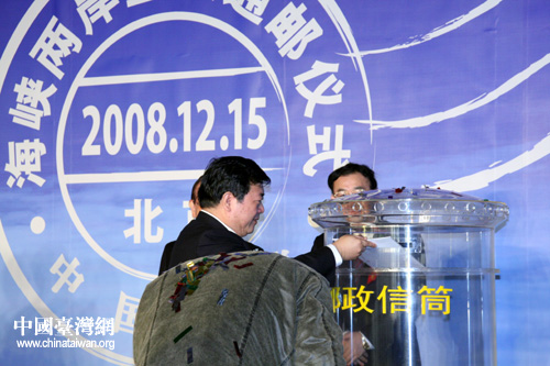 國務(wù)院臺灣事務(wù)辦公室副主任孫亞夫等頭投交兩岸直接通郵首批信函。中國臺灣網(wǎng)記者 鐘寶華 攝
