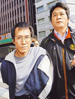 男子王建富(左)昨天上午朝臺(tái)“特偵組”丟玻璃瓶砸窗,被便服警員押回偵辦。(臺(tái)灣《蘋果日?qǐng)?bào)》圖片)