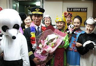 中國臺(tái)灣網(wǎng)12月27日消息 26日,四川航空公司從成都首航臺(tái)北松山機(jī)場,機(jī)身上彩繪著“四川人民感謝臺(tái)灣同胞在5.12地震期間為我們所提供的無私援助”字樣,而空姐穿著7個(gè)少數(shù)民族的服飾,還有空姐穿上臺(tái)灣目前最火的熊貓裝。