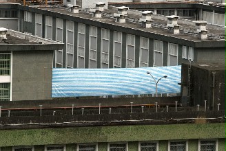 臺北看守所昨日下午在陳水扁放風運動的場地圍墻架起大型帆布,遮擋媒體鏡頭。(圖片來源:臺灣“聯(lián)合報” )