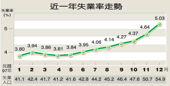 中國臺灣網(wǎng)1月23日消息 據(jù)臺灣《聯(lián)合報(bào)》報(bào)道,臺“主計(jì)處”昨天公布去年12月失業(yè)率高達(dá)5.03%,創(chuàng)下近6年同月新高,失業(yè)人數(shù)逼近55萬人,若加計(jì)隱藏性失業(yè),總失業(yè)人數(shù)超過80萬人;連帶使得去年全年的“痛苦指數(shù)”創(chuàng)近27年新高。
