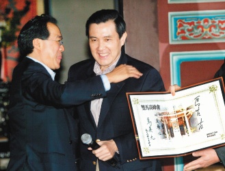 馬英九(右)與大提琴家馬友友(左)昨在板橋林家花園對談,兩人相談甚歡,并在“雙馬高峰會”紀(jì)念簿上簽名。(臺灣《聯(lián)合報》圖片)
