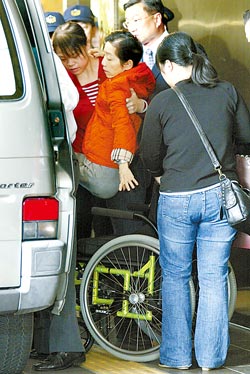 吳淑珍10日下午抵達臺北地方法院時,看護將她抱下車坐上輪椅進入法院。來源:臺灣《中國時報》