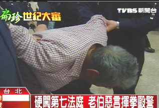 據(jù)臺媒報道,臺北地方法院今在第七法庭開庭審理扁家弊案,法庭外一位70多歲的老者不聽法警勸說要硬闖第七法庭,觀看陳水扁的庭訊過程。為維持法院秩序,多名法警將這位老者圍住希望將其帶離現(xiàn)場,沒想?yún)s引來老者的反抗和辱罵,混亂中一名法警被老者揮拳打中。最后在人數(shù)優(yōu)勢下,法警把這名老者架離法院現(xiàn)場。