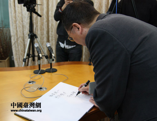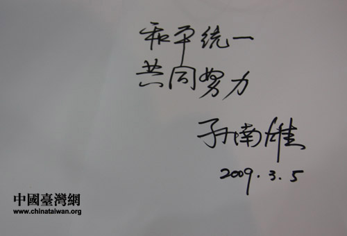 采訪結(jié)束后,孫南雄欣然在留言本上留言:和平統(tǒng)一、共同努力