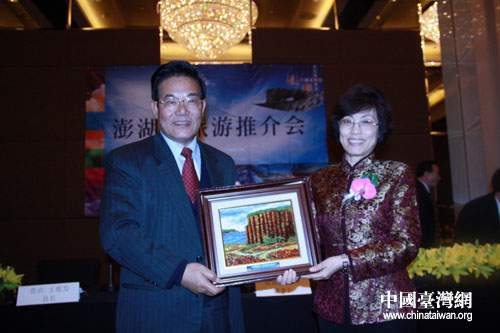 澎湖縣長王乾發(fā)和北京市旅游業(yè)界代表、北京市旅游局巡視員熊玉梅互贈禮物。(中國臺灣網 鐘寶華 攝)