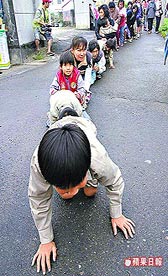許多小學(xué)生由老師陪同鉆轎底,希望功課進(jìn)步、身體健康。來源:臺灣《蘋果日報(bào)》
