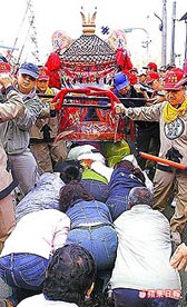 大甲媽祖繞境,信眾擠成三排趴在濕冷馬路上爭鉆轎底。來源:臺灣《蘋果日報(bào)》