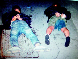 警方在兇宅外制伏兇嫌,兩人手上和地下都是死者的血。(圖片來源:臺灣《聯(lián)合報》)