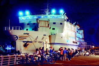 8000多噸級的“臺華輪”,是高雄、馬公間的主要客貨兩用交通輪,尤其在臺風(fēng)來襲前更擔(dān)負主要的輸運旅客任務(wù),船齡18年,船上設(shè)有購物商店、客房、臥鋪和座位,并可載運車輛和貨物。