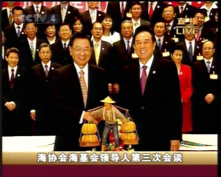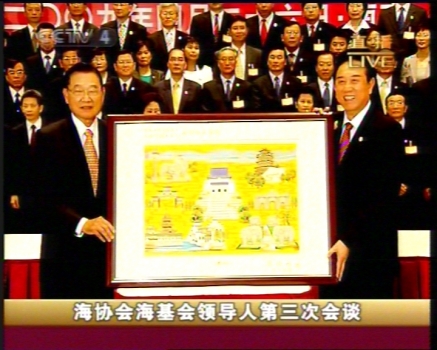 江丙坤向陳云林贈送皮雕 (CCTV截圖)