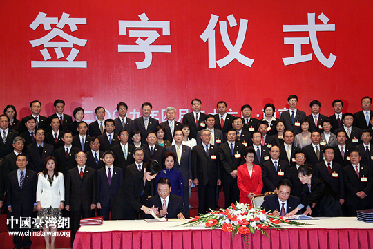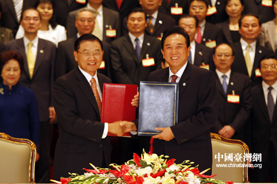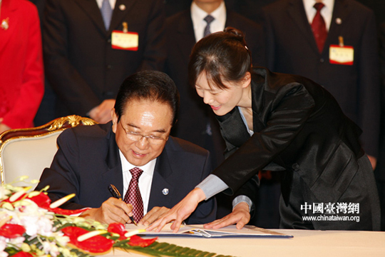 ;鶗麻L江丙坤簽署協(xié)議。26日下午三時許,海協(xié)會會長陳云林與臺灣;鶗麻L江丙坤在南京紫金山莊正式簽署《海峽兩岸空運補充協(xié)議》、《海峽兩岸金融合作協(xié)議》、《海峽兩岸共同打擊犯罪及司法互助協(xié)議》。(中國臺灣網(wǎng) 鐘寶華 攝)