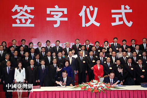 海協(xié)會會長陳云林與海基會董事長江丙坤簽署協(xié)議。26日下午三時許,海協(xié)會會長陳云林與臺灣海基會董事長江丙坤在南京紫金山莊正式簽署《海峽兩岸空運補充協(xié)議》、《海峽兩岸金融合作協(xié)議》、《海峽兩岸共同打擊犯罪及司法互助協(xié)議》。(中國臺灣網(wǎng) 鐘寶華 攝)