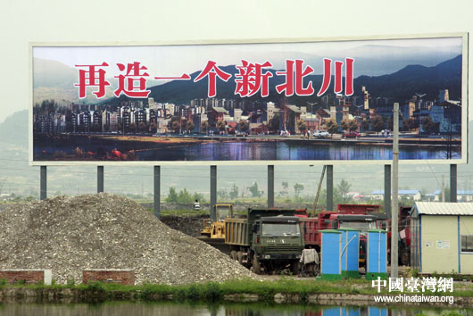 “再造一個新北川”的巨幅規(guī)劃圖巍然屹立在北川新城建設施工現(xiàn)場。(中國臺灣網 鐘寶華 攝)