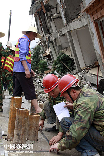 北川老縣城內,施工工人正在緊張忙碌,對傾危建筑進行加固作業(yè),這里將建成地震遺址博物館。(中國臺灣網 鐘寶華 攝)