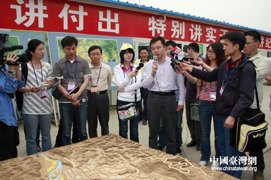 北川新城地址上,北川縣副縣長賀旺為兩岸媒體介紹北川新城規(guī)劃建設情況。(中國臺灣網 鐘寶華 攝)