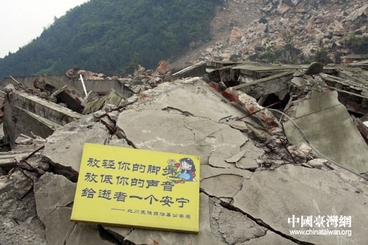 北川老城地震遺址廢墟上提示牌。(中國臺灣網 鐘寶華 攝)