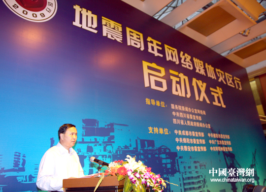 5月5日,四川省委宣傳部常務(wù)副部長、省政府新聞辦主任侯雄飛在“地震周年網(wǎng)絡(luò)媒體災(zāi)區(qū)行活動(dòng)”啟動(dòng)儀式上致辭。當(dāng)晚,“地震周年網(wǎng)絡(luò)媒體災(zāi)區(qū)行活動(dòng)”在四川省成都市啟動(dòng),來自全國50家中央和各省(區(qū)、市)重點(diǎn)新聞網(wǎng)站及知名商業(yè)網(wǎng)站,將在今后的8天時(shí)間里深入災(zāi)區(qū)一線,聚焦災(zāi)區(qū)重建見證抗震救災(zāi)精神!。ㄖ袊_(tái)灣網(wǎng) 田云鵬 攝)