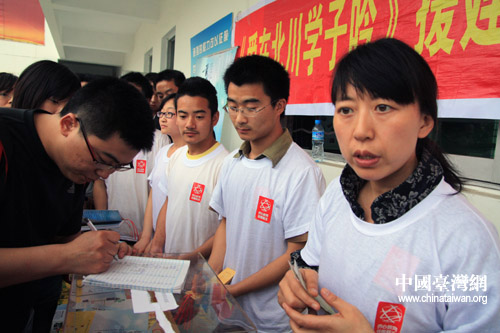 綿陽師范大學(xué)的師生正在為援建北川中學(xué)進(jìn)行《愛在北川學(xué)子吟》的義賣活動(dòng)。(中國臺(tái)灣網(wǎng) 田云鵬 攝)