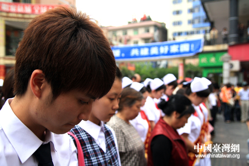 12日14時28分,四川雅安市民聚集在廣場為在“5·12”特大地震中遇難的同胞默哀。 (中國臺灣網(wǎng) 田云鵬 攝)