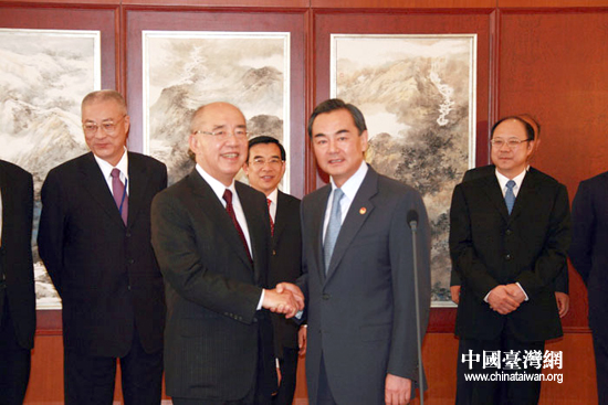 中國國民黨主席吳伯雄率領(lǐng)中國國民黨大陸訪問團(tuán)于25日11時(shí)5分許乘機(jī)抵達(dá)北京,開始訪問大陸行程。中共中央臺辦主任王毅到機(jī)場迎接。(中國臺灣網(wǎng) 鐘寶華 攝)