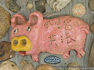 呂共法夢(mèng)想以藝術(shù)營(yíng)造小區(qū)讓北平村有了大轉(zhuǎn)變,村民聯(lián)手做了一只粉紅豬,將感恩寫(xiě)在豬身上。(圖片來(lái)源:臺(tái)灣“今日新聞”)