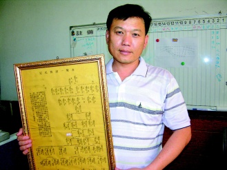記堂溢拿出族譜說,祖先原姓陳,因與人打賭輸了改姓記,全臺只此一家,別無分號。(圖片來源:臺灣《聯(lián)合報》)