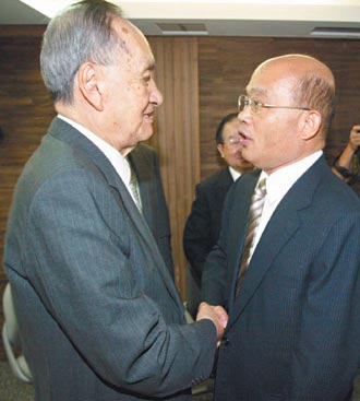 前陳水扁辦公室資政彭明敏(左)昨天舉行新書發(fā)表會(huì),來賓幾乎是“獨(dú)派”大會(huì)師,蘇貞昌(右)也到場祝賀。來源:臺(tái)灣《聯(lián)合報(bào)》