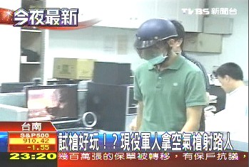 中國(guó)臺(tái)灣網(wǎng)6月17日消息 據(jù)臺(tái)灣TVBS電視臺(tái)報(bào)道,日前,一名臺(tái)灣現(xiàn)役軍人為了“好玩”,竟然伙同以前的高中同學(xué)拿氣槍射擊路人和車輛。