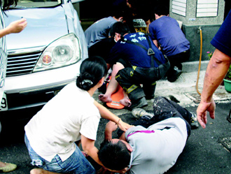 臺(tái)中縣烏日王姓婦女,因與媽媽在電話中發(fā)生爭(zhēng)吵,激動(dòng)得跳樓輕生,壓傷在樓下用手接的夫婿,并撞凹旁邊的車子。(圖片來(lái)源:臺(tái)灣《聯(lián)合報(bào)》)