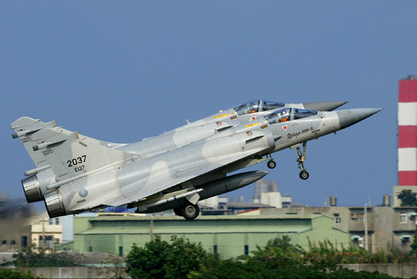 陳金龍是臺空軍首位幻影戰(zhàn)機(jī)飛行員,圖為臺灣空軍幻影2000-5雙機(jī)編隊(duì)起飛。(圖片來源:人民網(wǎng))