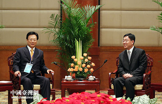 國家旅游局副局長杜江26日會見來京營銷農(nóng)特產(chǎn)品和旅游的臺中市、彰化縣、臺中縣、南投縣主要負責人。杜江同彰化縣縣長卓伯源交談。(中國臺灣網(wǎng) 鐘寶華 攝)