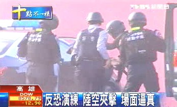 中國臺灣網(wǎng)7月10日消息 據(jù)臺灣TVBS電視臺報道,高雄市警局今天下午舉行反恐演練,模擬世運會開幕遇到恐怖襲擊,警方出動直升機高空垂降攻堅制服嫌犯,但由于爆炸場面太過逼真,有攝影記者的攝影機鏡頭被爆裂物打壞。