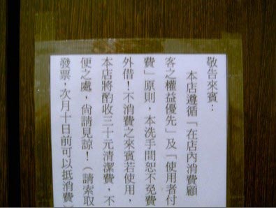 臺北火車站附近一家簡餐連鎖店在洗手間里張貼告示,稱該店本著使用者付費的原則,洗手間不免費外借,不消費者將收新臺幣30元清潔費,使用者可以索取發(fā)票,在下月10日前可抵該店消費。(高大林)(圖片來源:臺灣今日新聞)
