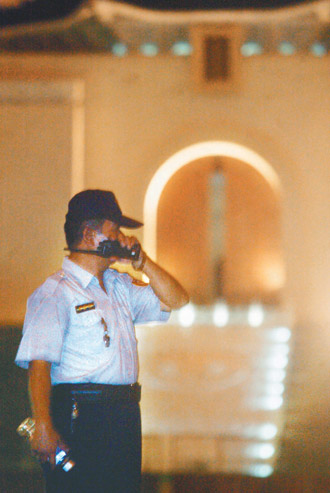 臺北中正紀(jì)念堂管理處今天將拆除“灣民主紀(jì)念館”匾,為防止意外發(fā)生,警察昨天入夜后即站崗待命,并凈空自由廣場內(nèi)的民眾。(圖片來源:臺灣《聯(lián)合報(bào)》)