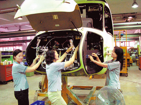 臺(tái)南地檢署偵辦漢翔公司官商勾結(jié)浮報(bào)軍機(jī)維修案,檢方認(rèn)定共浮報(bào)軍機(jī)維修費(fèi)1.4億多元新臺(tái)幣,20日將7名官商,分別依貪污等罪提起公訴。圖為漢翔公司內(nèi)3位女工,正在組裝S-92直升機(jī)駕駛座艙。(臺(tái)灣《中國(guó)時(shí)報(bào)》資料圖片)