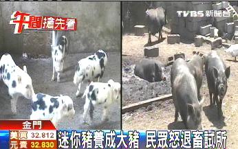 中國(guó)臺(tái)灣網(wǎng)7月23日消息 據(jù)臺(tái)灣TVBS電視臺(tái)報(bào)道,臺(tái)灣金門(mén)一位許姓民眾,3年前向金門(mén)畜產(chǎn)試驗(yàn)所買(mǎi)了一對(duì)“迷你豬”,養(yǎng)了3年后,“迷你豬”卻變成100公斤重的大豬,還生了很多大豬,他決定要抗議,把“這些不迷你的迷你豬”,還給金門(mén)畜產(chǎn)試驗(yàn)所。