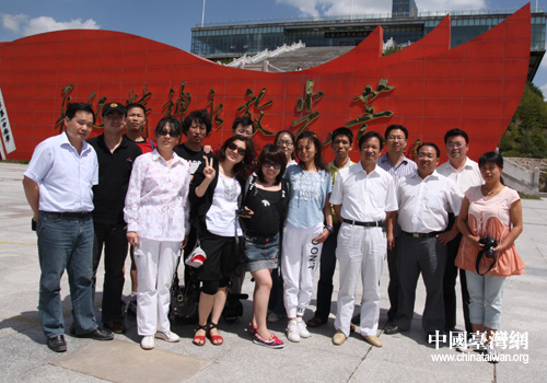7月22日,參加兩岸媒體寧夏南部行的大部分記者和當(dāng)?shù)毓賳T在六盤山紅軍長征紀(jì)念館前合影留念。(中國臺(tái)灣網(wǎng) 楊永青 攝)
