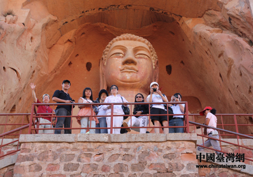 兩岸的記者在須彌山石窟中最大的石窟前合影留念(中國臺(tái)灣網(wǎng) 楊永青 攝)