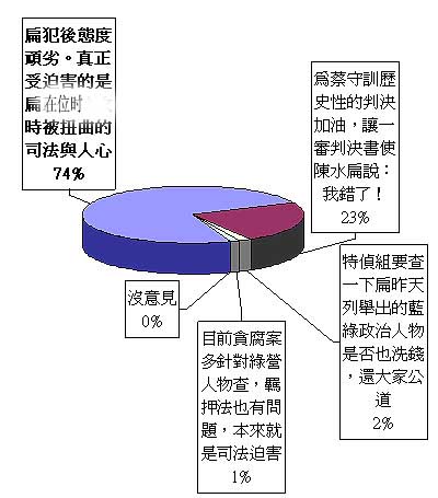 報(bào)道稱,纏訟多時的陳水扁家弊案即將在9月11日宣判,盡管檢察官指證歷歷,但涉案的陳水扁仍堅(jiān)稱自己無罪,并高喊“司法”迫害。但這次民調(diào)的詳細(xì)結(jié)果卻給了陳水扁一個有力的回?fù)簦?選項(xiàng)一:“陳水扁犯后態(tài)度頑劣。真正受迫害的是陳水扁執(zhí)政時被扭曲的‘司法’與人心”獲得1711票,占全體投票人數(shù)的73.9%; 選項(xiàng)二:“為蔡守訓(xùn)歷史性的判決加油,讓一審判決書使陳水扁說:我錯了!”獲得531票,占22.9%;選項(xiàng)三:“特偵組要查一下陳水扁前天列舉出的藍(lán)綠政治人物是否也洗錢,還大家公道”獲得42票,占1.8%;選項(xiàng)四:“目前貪腐案多針對綠營人物查,‘羈押法’也有問題,本來就是‘司法’迫害”獲得32票,占1.4%; 選項(xiàng)五:“沒意見”,則獲得0票。
