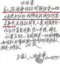 孫海濤3年前曾寫(xiě)切結(jié)書(shū)給賴(lài)佳雯,內(nèi)容提出保證不對(duì)她究責(zé)(紅線(xiàn)處)。圖片來(lái)源:臺(tái)灣《蘋(píng)果日?qǐng)?bào)》